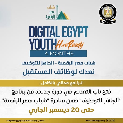 نشرت الصفحة الرسمية لرئاسة مجلس الوزراء على “فيسبوك” اليوم الخميس، عن فتح باب التقديم في دورة جديدة من “برنامج الجاهز للتوظيف”، وذلك ضمن مبادرة شباب مصر الرقمية، حتى 20 ديسمبر من الشهر الجاري.