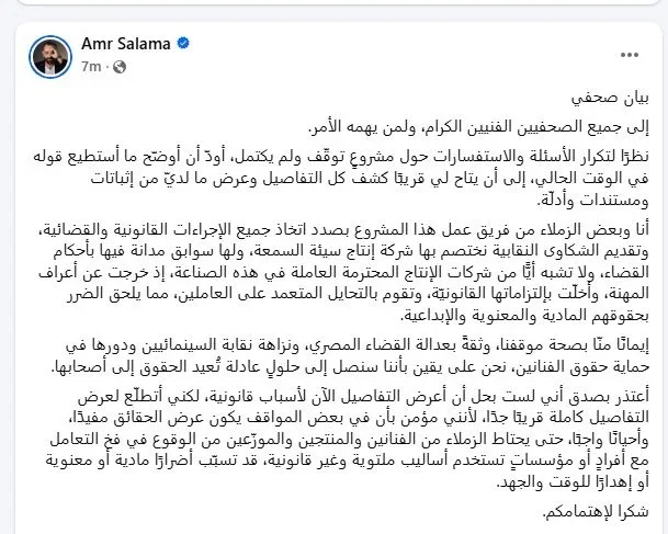في بيانه الرسمي الجديد، وجّه عمرو سلامة كلمته إلى الإعلاميين والفنانين وكل المهتمين بالأمر، قائلًا: