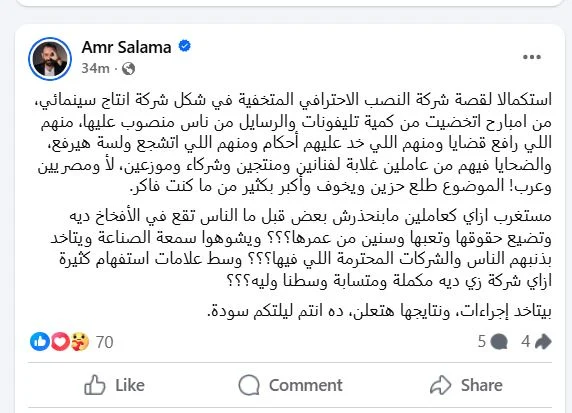 “استكمالًا لقصة النصب الاحترافي المتخفية في شكل شركة إنتاج سينمائي، من امبارح اتخضيت من كمية التليفونات والرسائل من ناس منصوب عليهم… الضحايا كتير، من عاملين غلابة لفنانين ومنتجين وموزعين، ومصريين وعرب. الموضوع طلع حزين وبخوف وأكبر من ما كنت متخيل”.