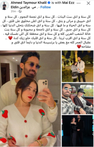 “كل سنة وأنتِ جنبي، كل سنة وأنتِ ناجحة ومحبوبة، وكل سنة بنت خالة الشعب العربي كله، وكل سنة وأنتِ محققة كل اللي نفسك فيه، كل سنة وأنتِ أقرب لربنا، كل سنة وأنتِ قلبك حلو زيك كده.. عقبال العمر كله مع بعض يا برنسيسة الدنيا، ودايمًا أنتِ قلبي ومفتاحه”.